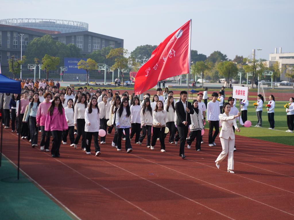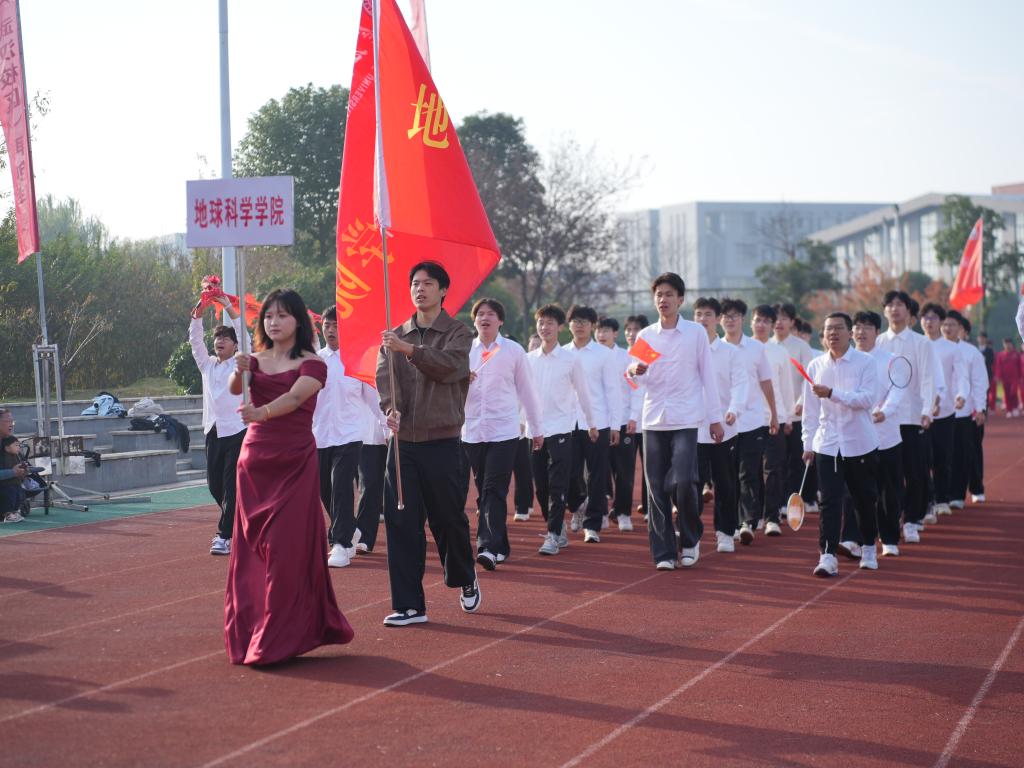 开幕式现场:国旗护卫队队员身着整齐制服,迈着铿锵有力的步伐,昂首挺胸护卫着五星红旗走过主席台。随后,2024级本科女生组成的鲜花队,地科、油工、地物、资环、传媒学院师生代表队以及武管会和延伸部门代表队依次入场,队员们精神抖擞、步伐坚定,带着饱满的热情与自信,展现出独特的运动风采。校区各学院师生代表方阵精彩的创意表演赢得现场阵阵掌声,将开幕式气氛推向高潮。