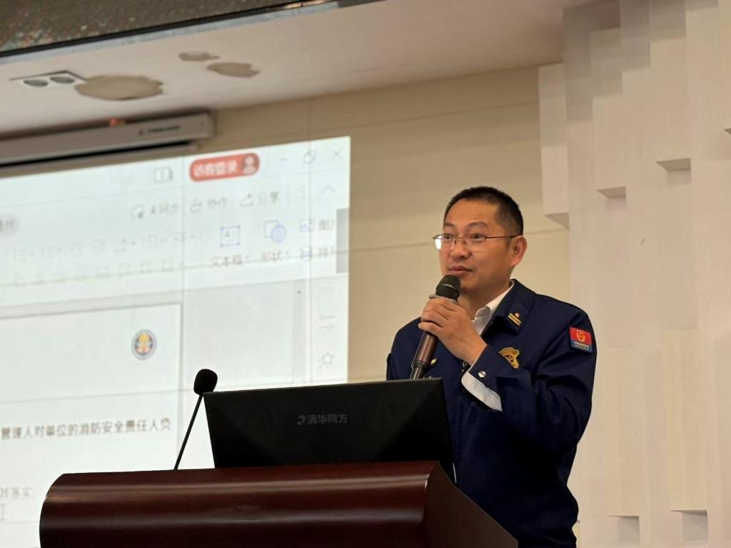 廖志龙副队长首先围绕《中华人民共和国消防法》《高等学校消防安全管理规定》等核心法规,结合校园场景解读关键条款,明确高校在消防安全管理中的法定职责,以及师生在火灾预防、应急处置中的权利与义务,让参会人员深刻认识到消防安全工作的法治属性。随后,他重点强调高校消防责任人的责任落实要求,从日常隐患排查、消防设施维护、应急预案制定、宣传教育组织等方面,明确责任清单与工作标准,引导各学院、部门层层压实责任,形成“人人有责、齐抓共管”的消防工作格局。