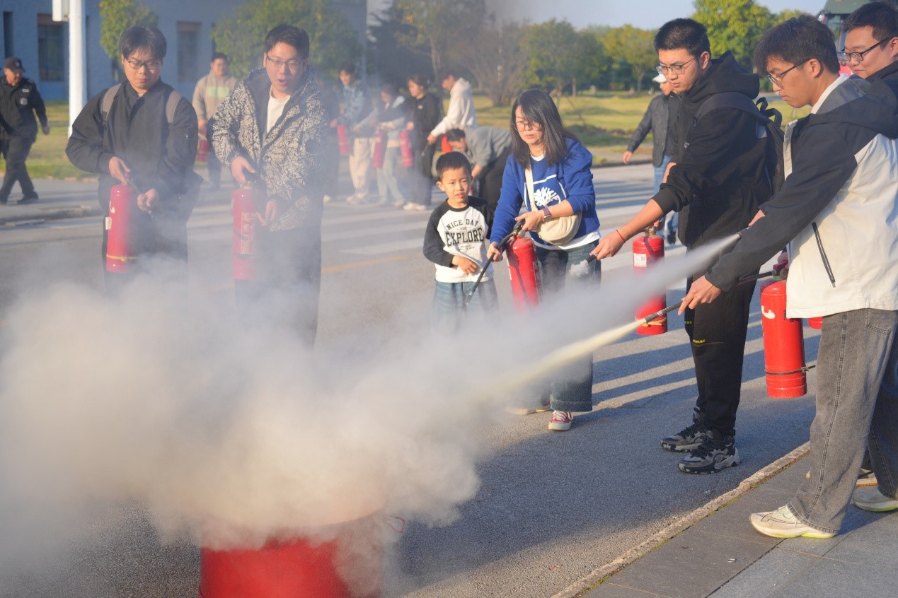 疏散结束后,蔡甸区消防救援大队消防员驾驶消防车抵达现场,进行云梯操作演示。震撼的场景让师生们直观感受专业救援力量。四名消防志愿者试穿消防服,体验消防员工作岗位艰辛。志愿者熊俊豪说:“消防作战服穿上特别沉重,头盔压得抬不起头,走两步就是气喘吁吁,消防战士身着沉重的作战服逆行而上,不顾自身安危守护人民群众安全,是这个时代最可敬的人!”安全保卫部工作人员在指定区域设置模拟火点,详细讲解灭火器“提、拔、握、压”使用步骤,组织师生现场实操,在“零距离”灭火体验中熟练掌握应急技能。