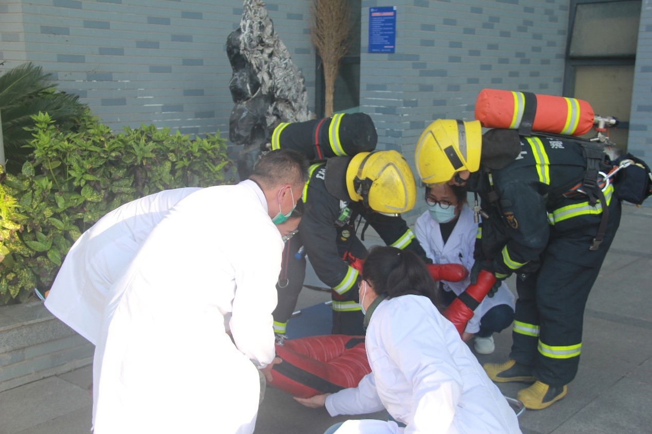 10分钟内,楼内500名师生全部安全撤离至石油科技大楼北广场集合点,各单位快速完成点名核对。期间,针对“被困人员”救援场景,由蔡甸区消防救援大队消防员开辟救援通道,在火场连接消防水带灭火,救出“被困人员”,安全救护组及时接应开展紧急救治,圆满完成模拟救援任务。