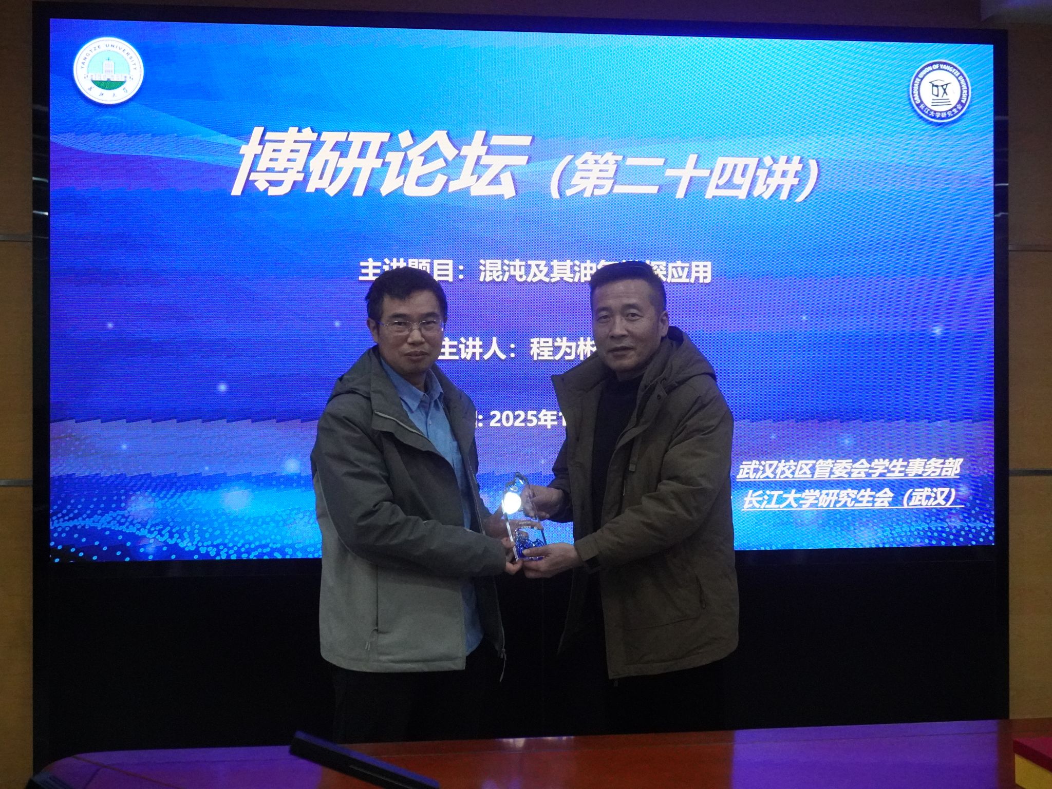 (通讯员 张晓宇/文 学生记者 高煜九、许康旺/摄)寒冬蕴智,学术暖场。12月24日下午的武管会会议室,地球物理与石油资源学院程为彬教授做客第24期“博研论坛”,以“混沌及其油气勘探应用”为主题为武汉校区研究生带来科研大餐。武汉校区党工委书记崔青山为程为彬颁发“博研论坛”奖杯。党委研工部副部长丁植磊、校区研究生工作办公室李莹和来自校区各学院的40余名研究生共同参与论坛。